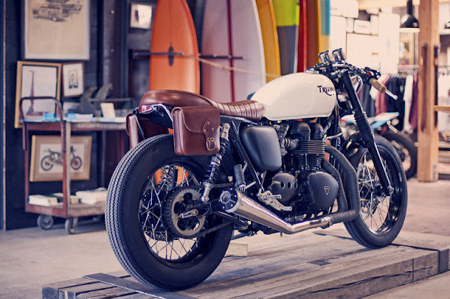No, I mean it. She has this ability to see what I am interested in and somehow find a way to show that it's cool with her that I am spending way too much time checking out this new thing. A couple three weeks ago I came across this picture of what I thought was an old cafe racer style bike. (Cafe racers started showing up in Britain and then later Europe in the late 50's and 60's. Guys with common interests in going fast and riding bikes would tinker and tune their off the shelf bikes or bikes they'd salvaged from a heap. After a while these stripped down two wheel hot hods began showing up in number at the highway cafes around Britain's major towns. The hot thing to do when 2 guys got to saying who's bike was fastest, was to put a song on the jukebox, a bet on the table, then both would hop out the door and as fast as they could ride down the road to the next cafe, turn round and be back before the song was over. The first one in the door took the bet.) These bikes were all the rage for a generation, and soon had their own mystique and unique styling that set them apart.